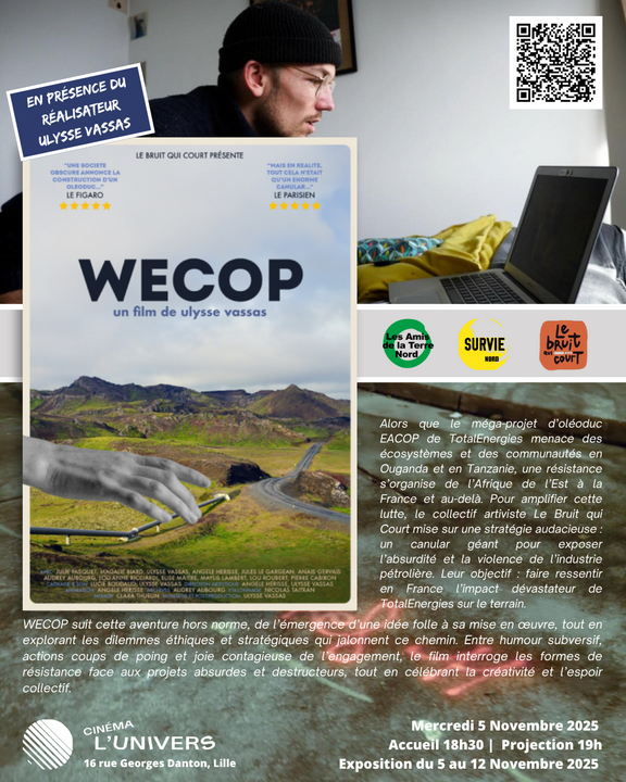 Assistez à la projection de "WECOP", un documentaire sur la lutte créative du collectif Le Bruit qui Court contre le projet pétrolier EACOP de TotalEnergies. À travers un canular audacieux, le film explore les enjeux d'une résistance innovante et joyeuse face à des projets destructeurs.